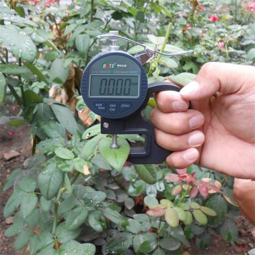 叶片厚度检测仪LS-5 0-12.7毫米,叶片是植物*重要的器官,其形态变化可以反映出植物生长状态的变化,如光合作用、水分情况、养分情况等。研究表明,叶片厚度变化具有周期规律性,可分为长周期和短周期(24小时)。掌握这些规律对研究植物水分状态具有重要意义。通常的灌溉系统是以空气的温度、湿度以及土壤的湿度作为控制参数,属于开环控制。针对这一问题,提出了以植物的器官(叶片、茎杆、果实)的几何参数为控制参数的智能节水灌溉控制系统,属于闭环控制。